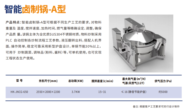 主要?于?制品等固状产品的煮制或?制,整机程序化控制,进料后?需员?操作,??减少员?劳动强度等,?动控温、?动控时、?动搅拌、?动翻锅。
