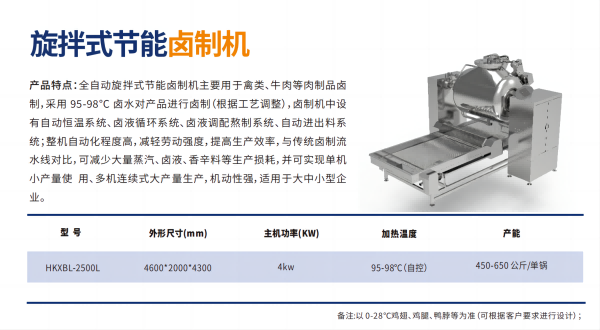 全?动旋拌式节能?制机主要?于禽类、??等?制品?制,采? 95-98 °C ??对产品进??制(根据?艺调整),?制机中设有?动恒温系统、?液循环系统、?液调配熬制系统、?动进出料系统;整机?动化程度?,减轻劳动强度,提??产效率,与传统?制流?线对?,可减少?量蒸汽、?液、??料等?产损耗,并可实现单机?产量使 ?、多机连续式?产量?产,机动性强,适?于?中?型企业。