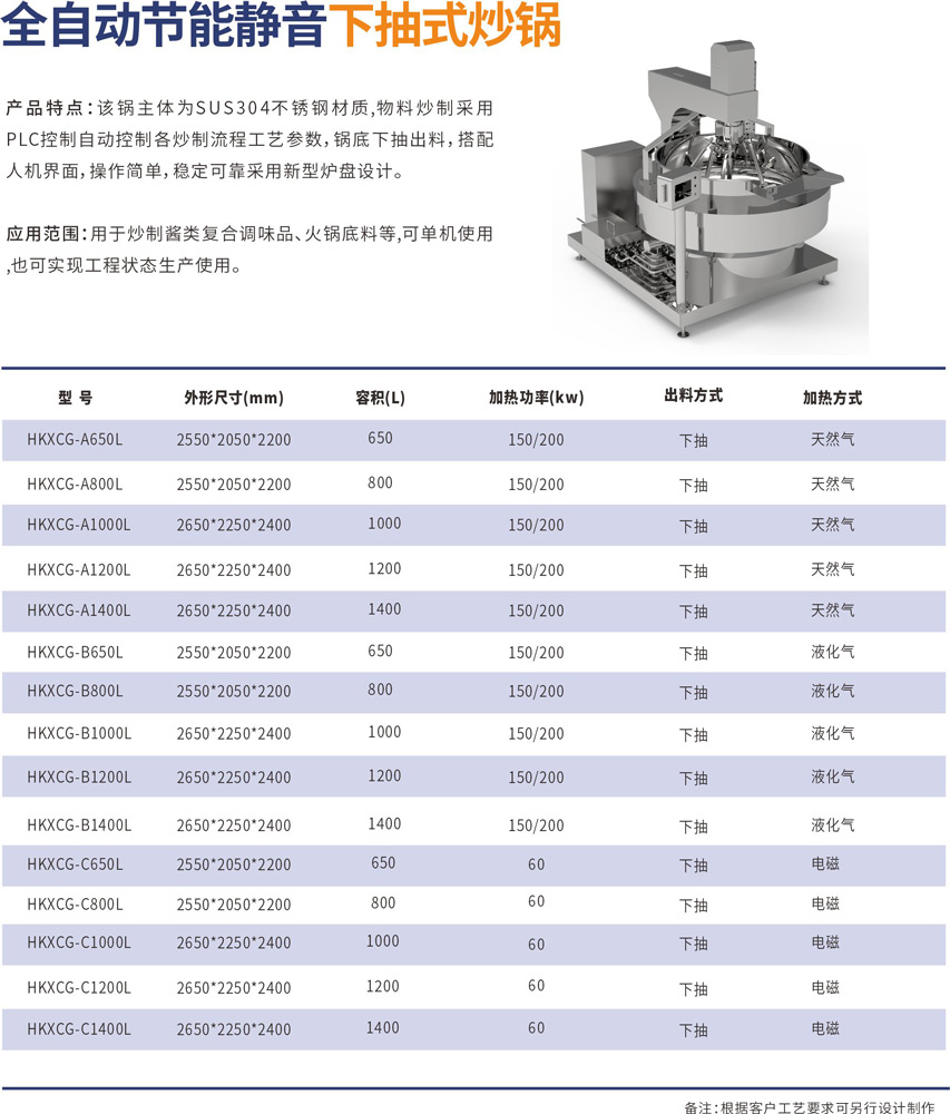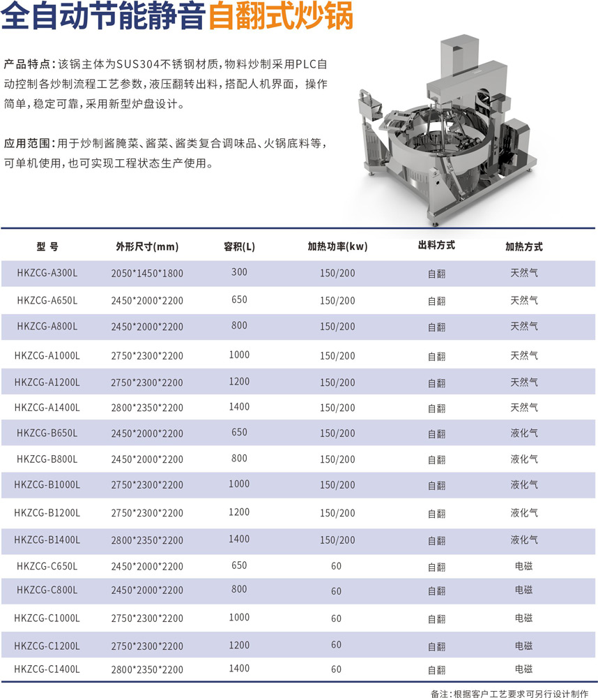 该锅主体为SUS304不锈钢材质,物料炒制采?PLC?动控制各炒制流程?艺参数,液压翻转出料,搭配?机界?, 操作简单,稳定可靠,采?新型炉盘设计。