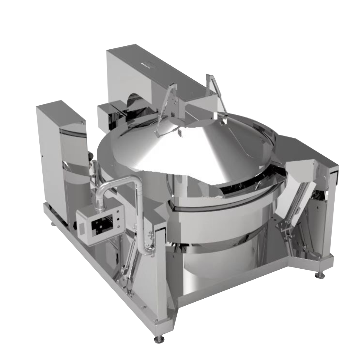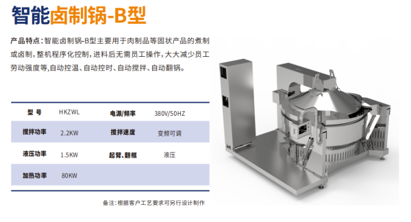 主要?于?制品等固状产品的煮制或?制,整机程序化控制,进料后?需员?操作,??减少员?劳动强度等,?动控温、?动控时、?动搅拌、?动翻锅。